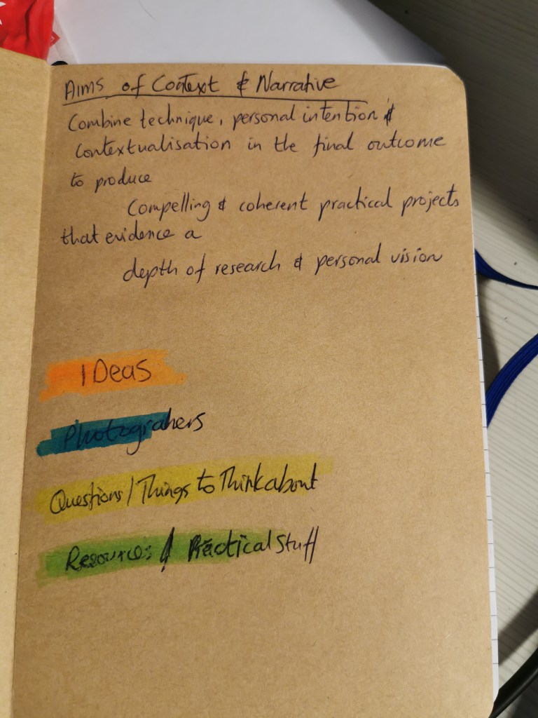 It was recommended a notebook is kept to record various aspects of my course and photography in general. I have kept this with me and I have found it very useful to jot down things that spring to mind that I don’t want to forget. I have also listened to photography podcasts on my journey to work such as one called “A Small Voice, Conversations With Photographers.” I have gained a huge amount from listening to these and have noted interesting things in my notebook.
