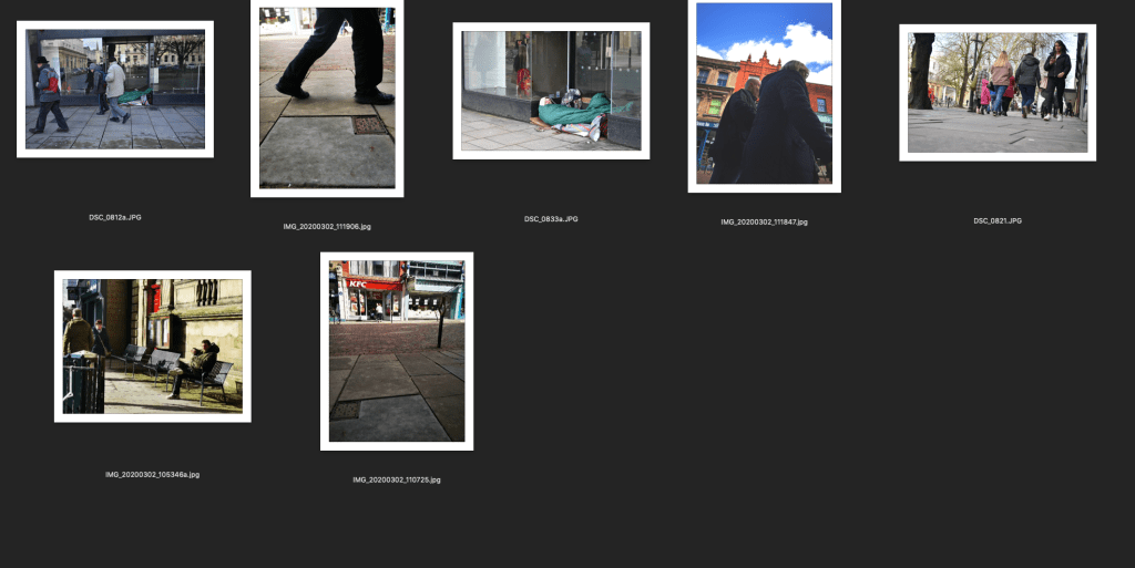 I am interested in social change for the better for all people and have a particular empathy for the homeless, I admire artists such as Anthony Luvera and Lee Jeffries who spent time with the people and treated them with dignity and respect and built up mutual trust before they embarked on a collaborative photography project. The projects also generated income for better support for them and also changed the way councils are obligated to support the homeless in the UK. This, ideally is how I would want to approach an activity such as this, but since it was just for an assignment at this time I chose the anonymous route this time.