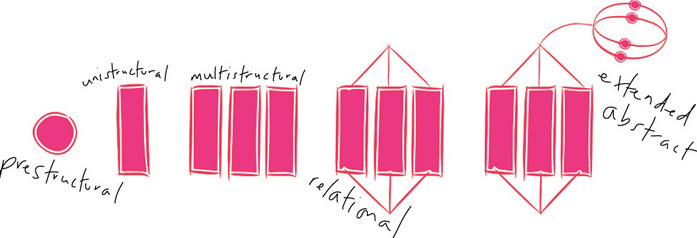 Prestructural: the student learns some unconnected information. Unistructural: simple obvious connections are made but their significance is not fully grasped. Multistructural: several connections are made, but the meta-connections between them are missed, as is their significance for the whole. Relational: the student is able to appreciate the significance of the parts in relation to the whole. Extended Abstract: the student is able to make connections not only within the given subject area, but also beyond it, able to generalise and transfer the principles and ideas underlying the specific instance.
